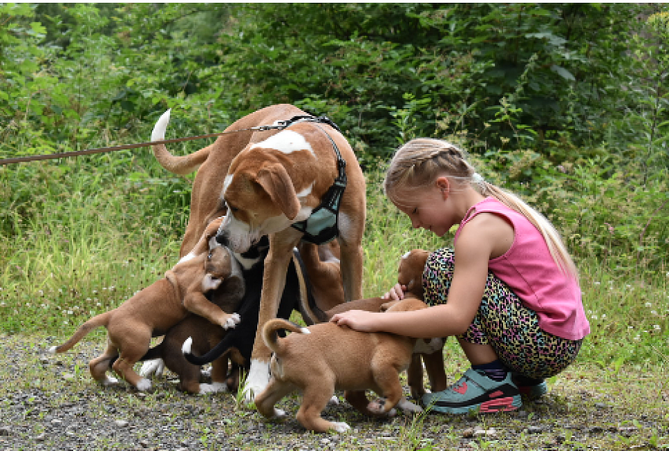 Um die Welpen zu schützen, dürfen besonders aufgeregte Kinder oder Besucher den Auslauf zunächst nur von außen beobachten, bis die Mutterhündin signalisiert, dass es in Ordnung ist.