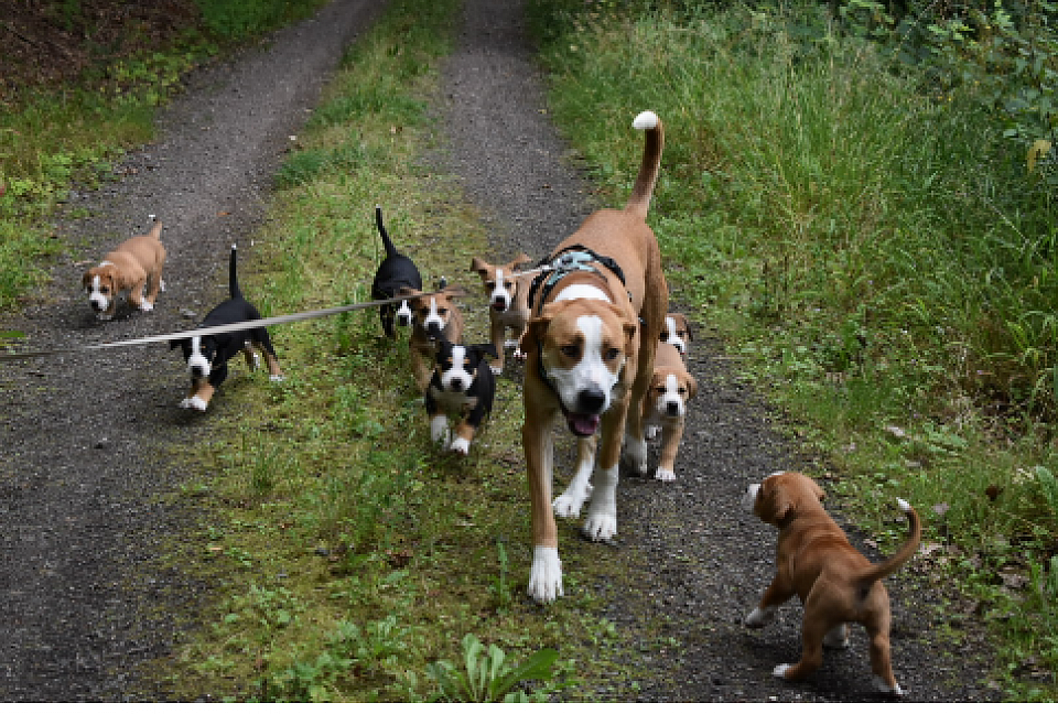 Durch die Beobachtung und das Vorbild der Mutterhündin lernen sie Selbstkontrolle, Ruhe und soziale Kompetenz.